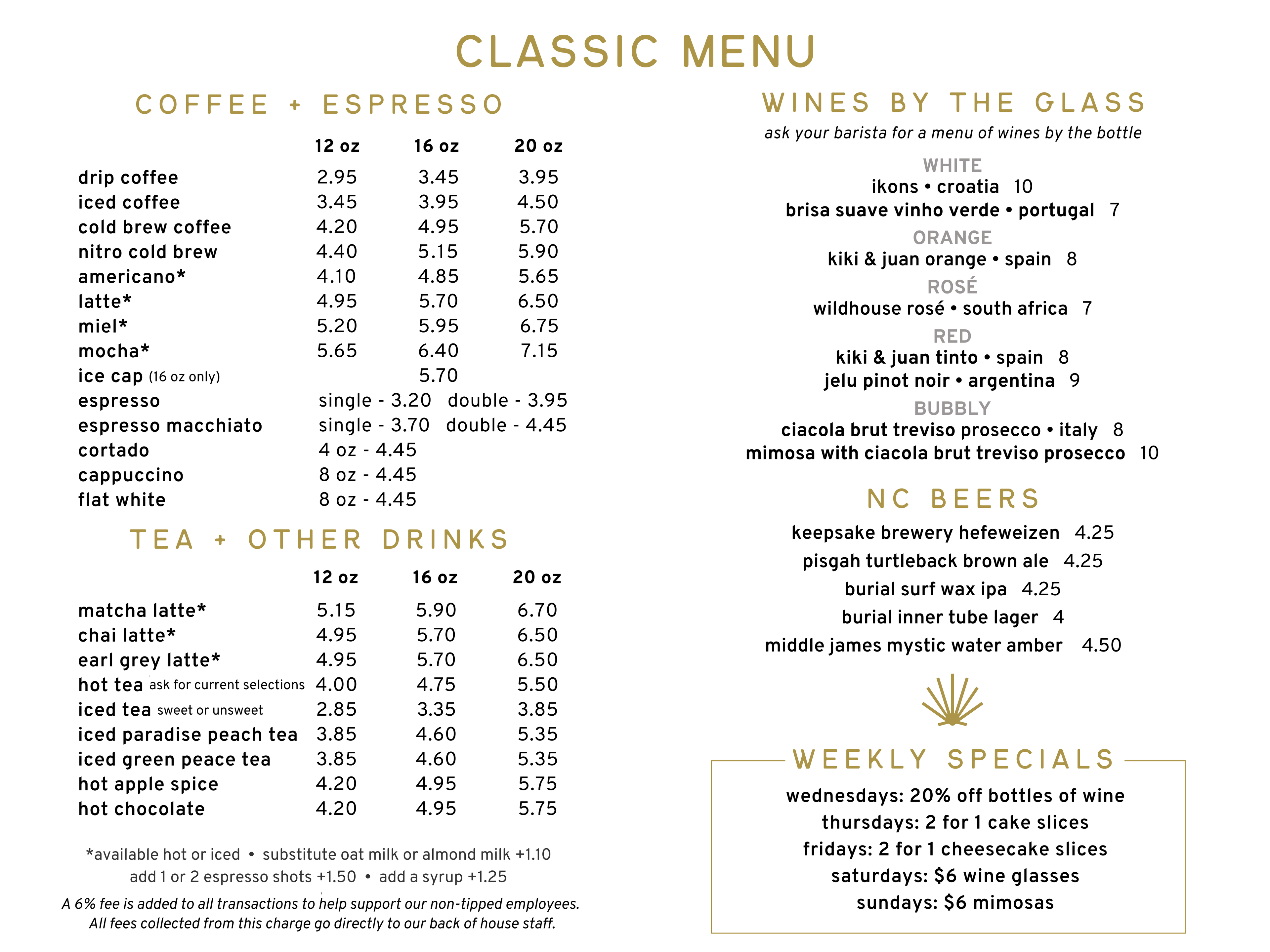 Our drinks are handcrafted by our skilled baristas. We make our syrups in house from scratch, partner with Methodical Coffee for our freshly roasted beans, and use milk from our local dairy farm, Homeland Creamery. We partner with locally-based Chad’s Chai, Vida Pour Tea, Methodical and Spirit Tea for our tea. We source organically-grown, small-production wines from family farms around the world.